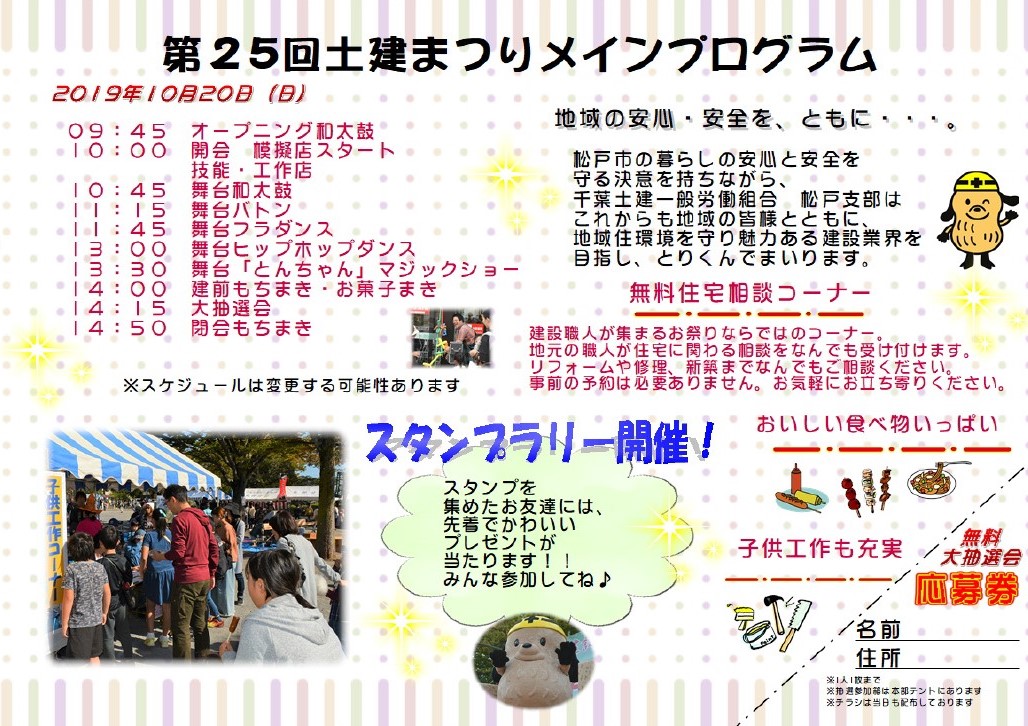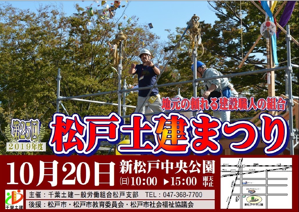 10/20(日)どけんまつり(松戸支部) 公開日時:2019/10/10 15:00 第25回土建まつり(松戸支部) 毎年3,000人が来場する土建まつりが今年も10月20日(日)10:00~15:00で開催します。会場は新松戸駅近くの新松戸中央公園です。模擬店はもちろん、建設組合らしい建前実演や職人の技を披露する技能店、子供工作教室なども行います。 お知らせ一覧へ戻る